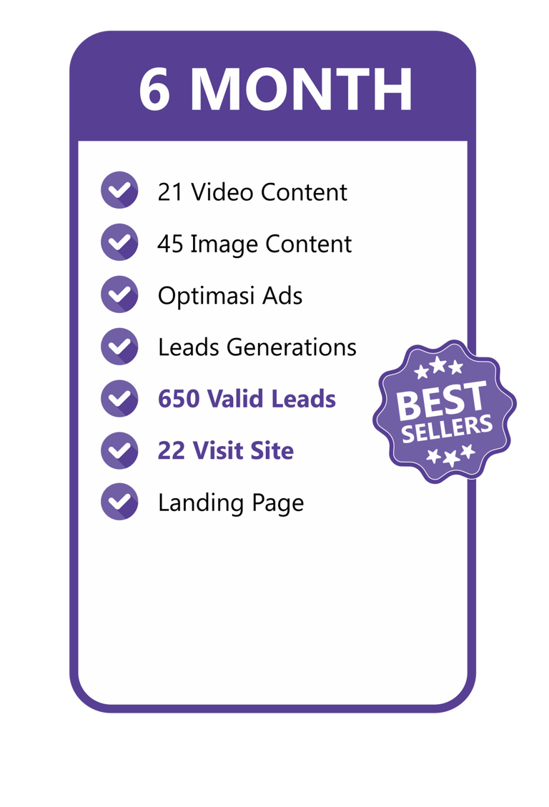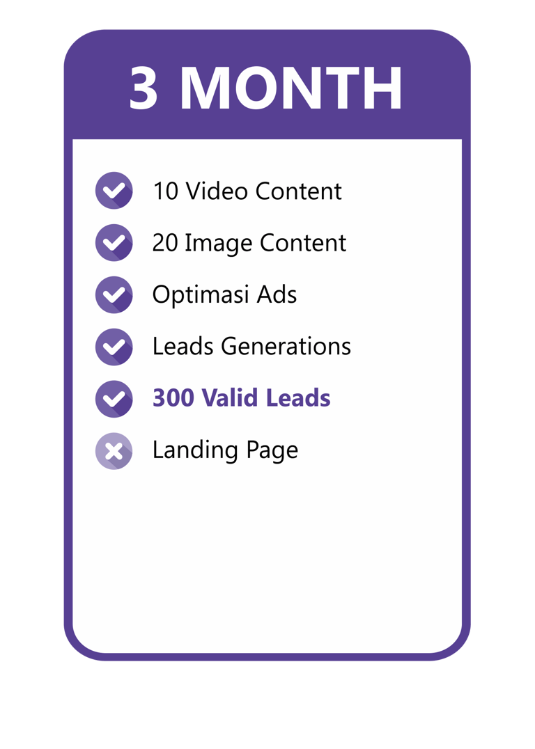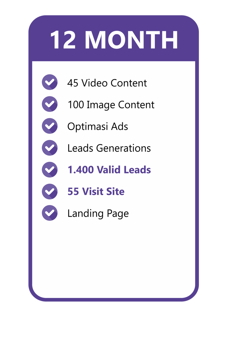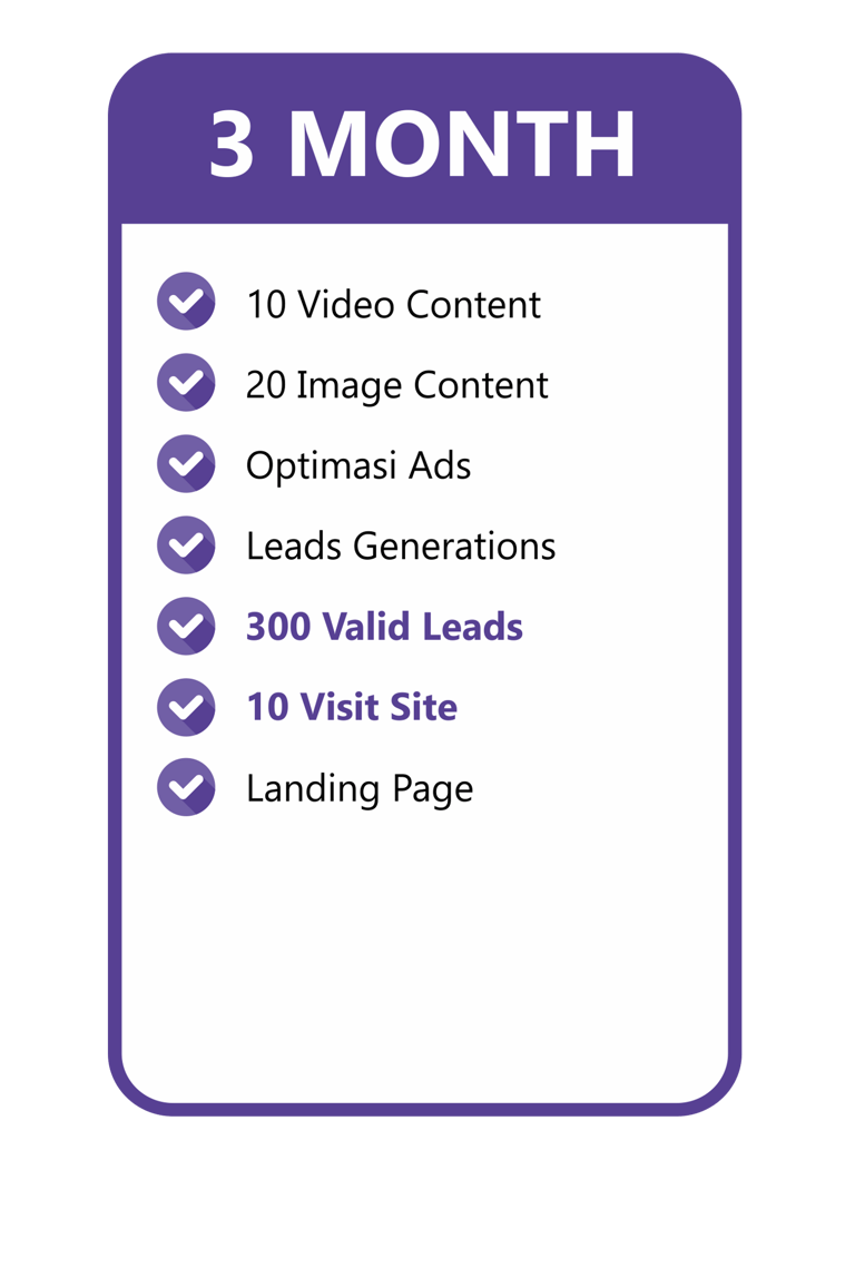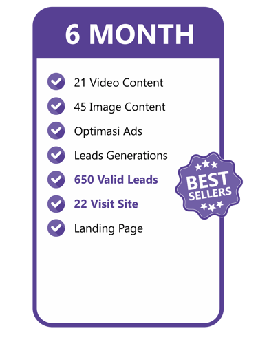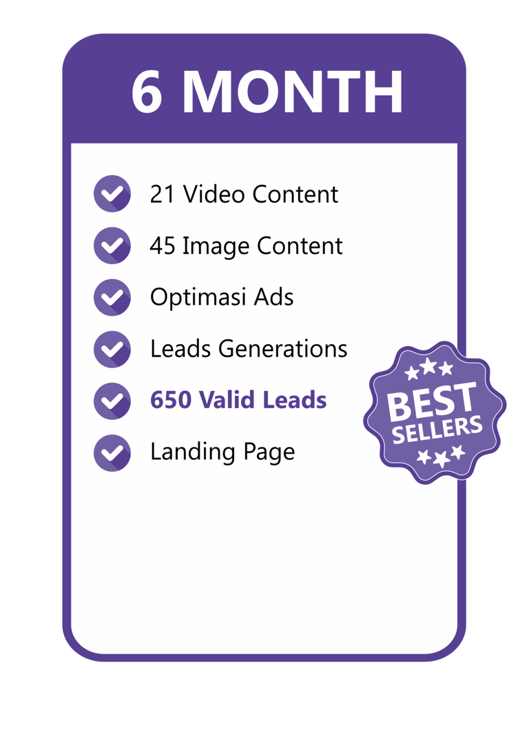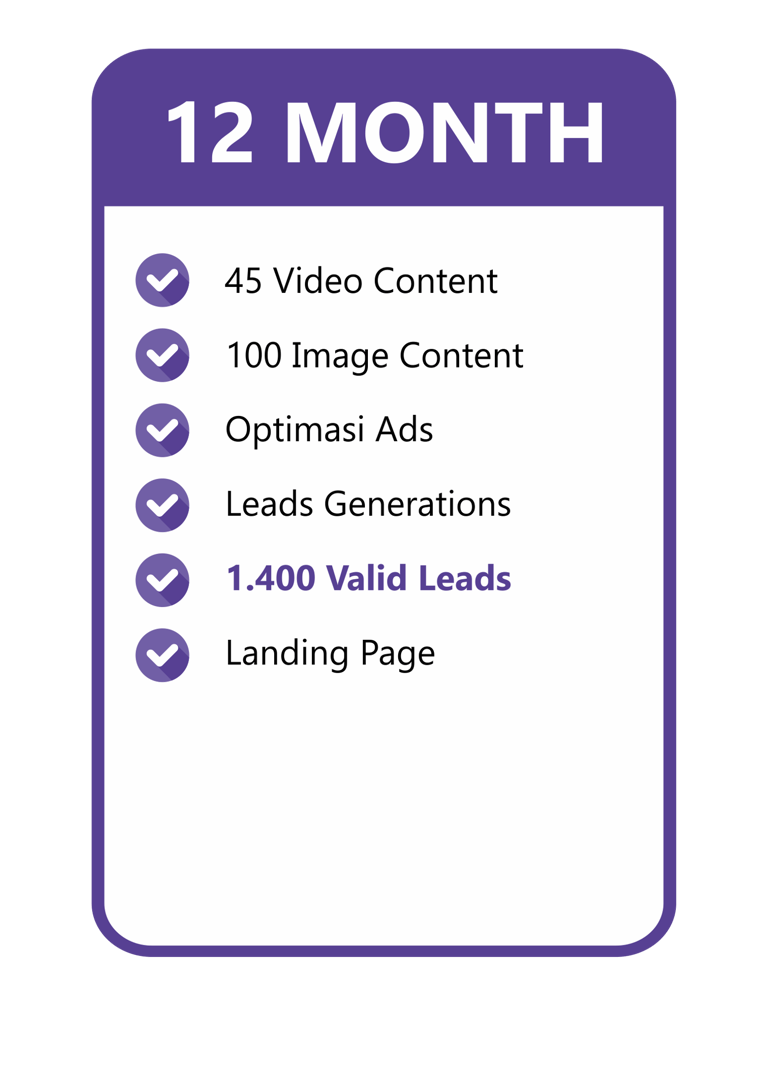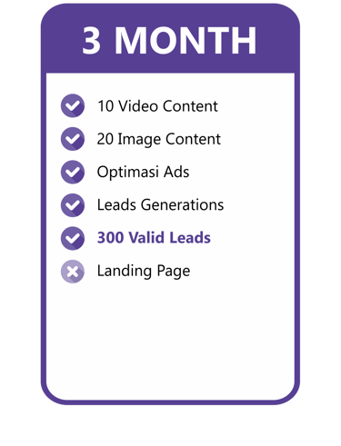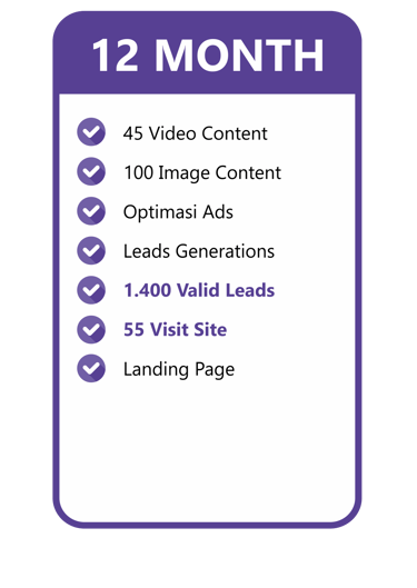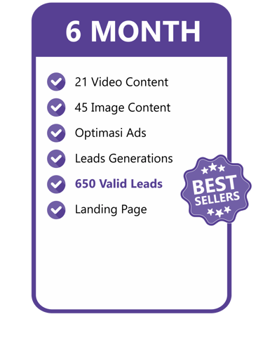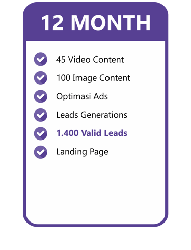 Konten video include dengan talent & gambar yang menarik kami buatkan, Optimasi Ads kami yang mengerjakan. Kamu tinggal tunggu Leads yang pasti Valid masuk untuk bisa langsung di Follow Up!